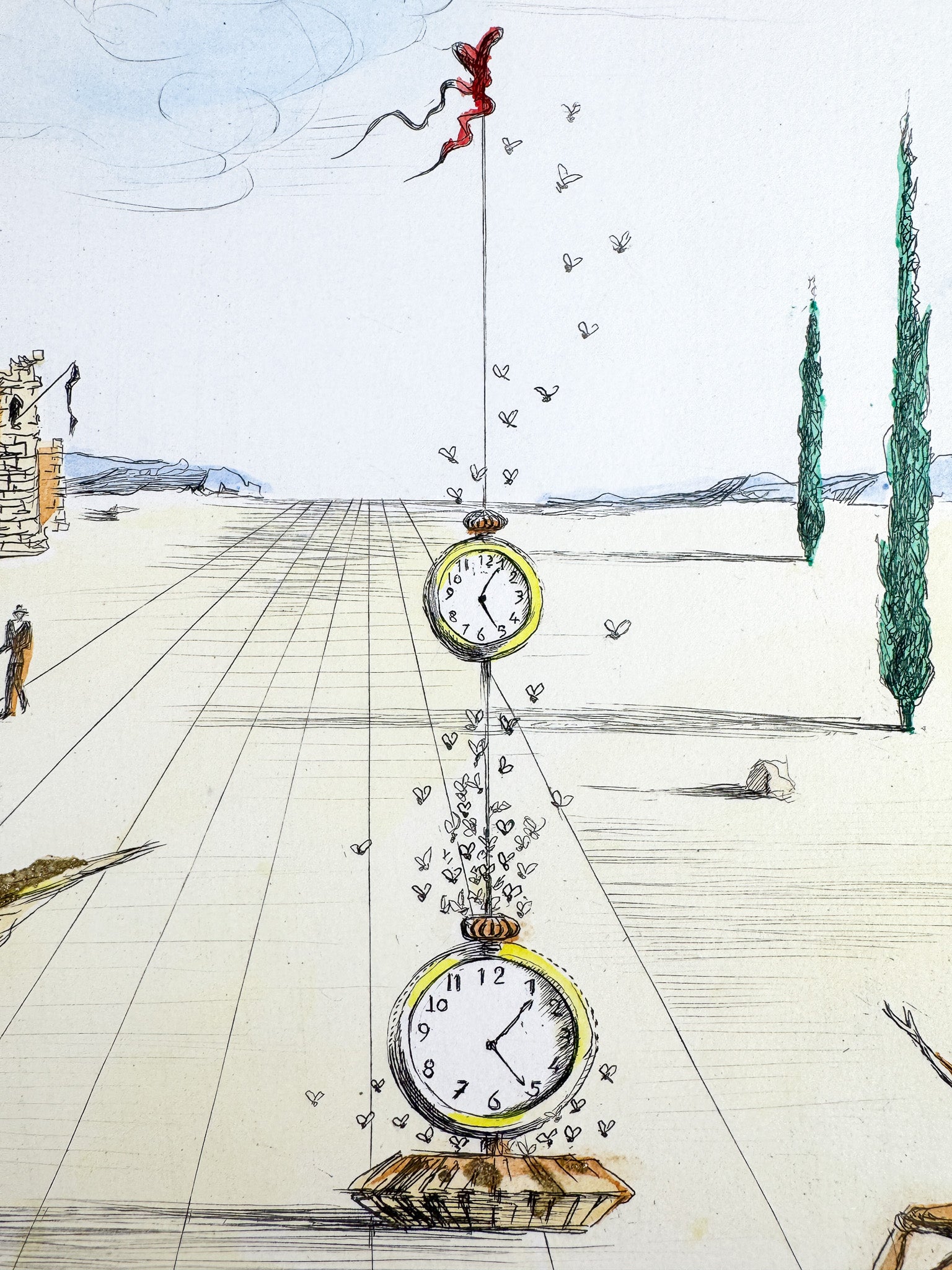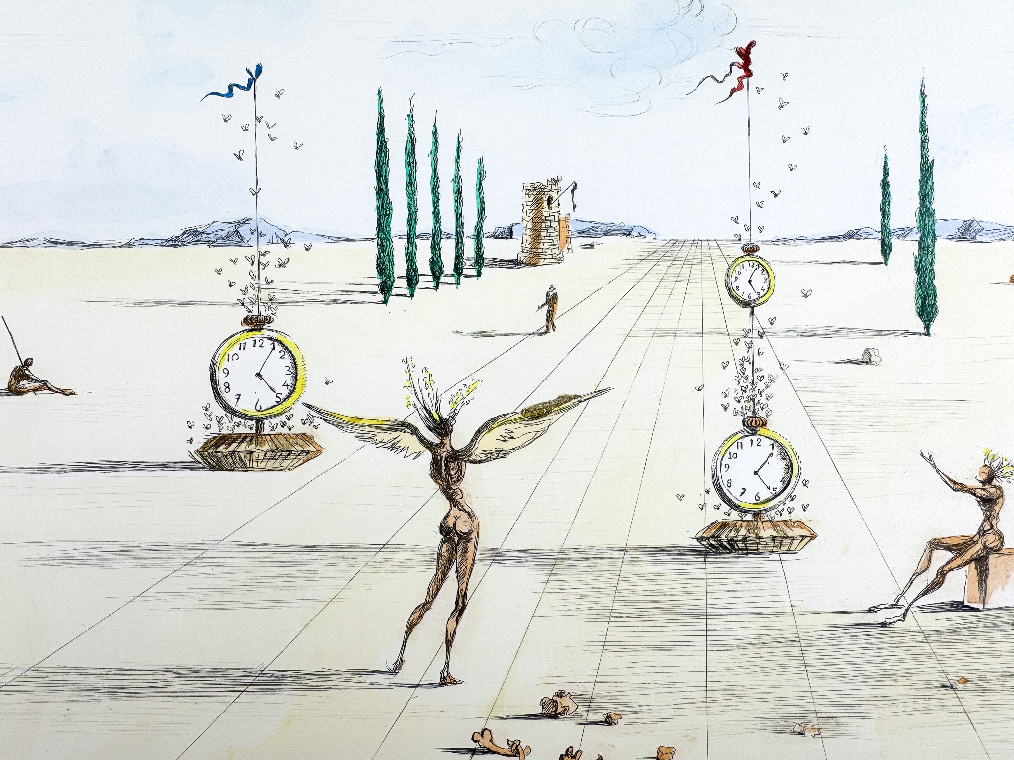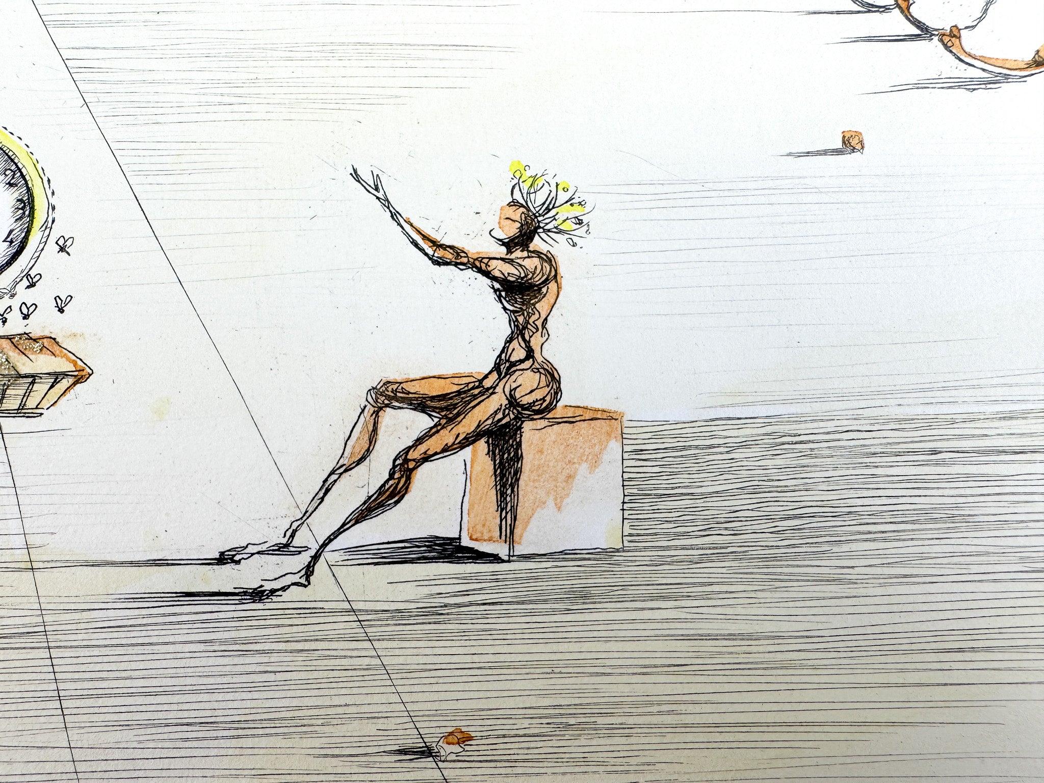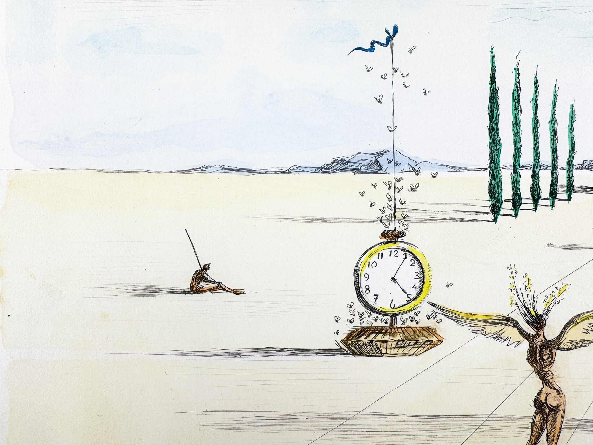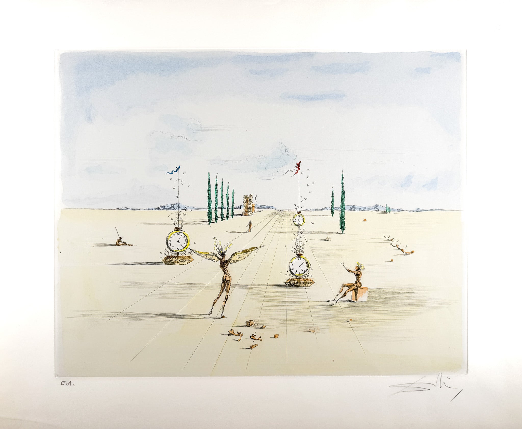 Diese poetische Farbradierung von Salvador Dalí aus dem Jahr 1973 entfaltet eine stille, zugleich irritierende Szenerie zwischen Ritual und Traum. Zeit, Bewegung und Leere werden zu einem offenen Bildraum von großer suggestiver Kraft. Als seltenes Épreuve-d’Artiste-Exemplar besitzt das Werk besondere Nähe zum schöpferischen Prozess und hohen Sammlerwert.