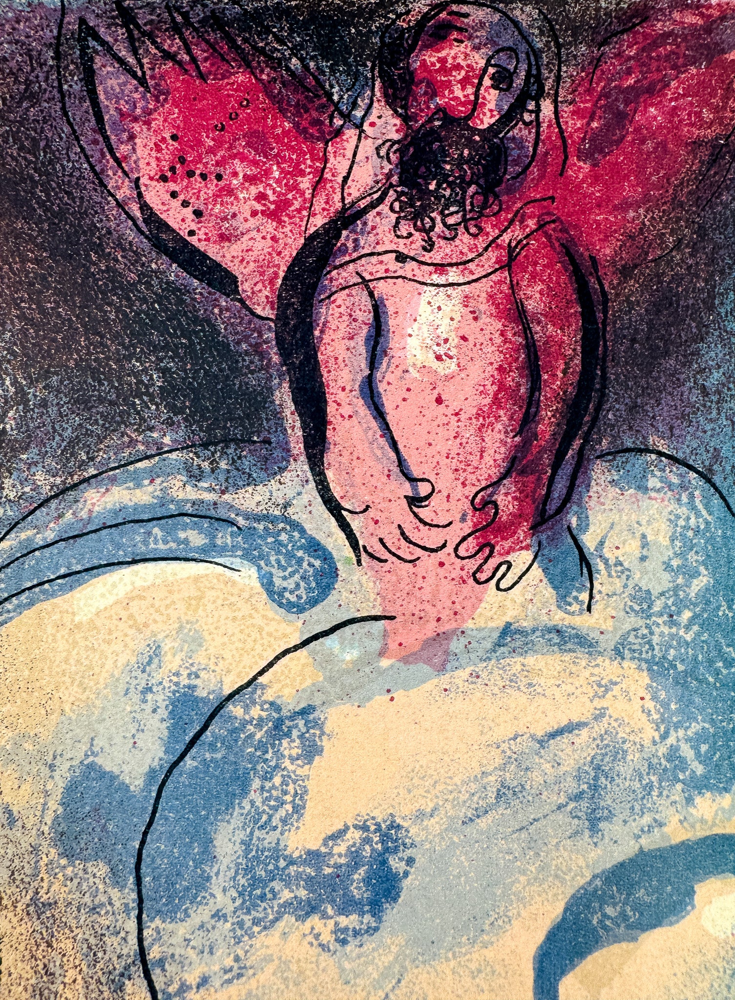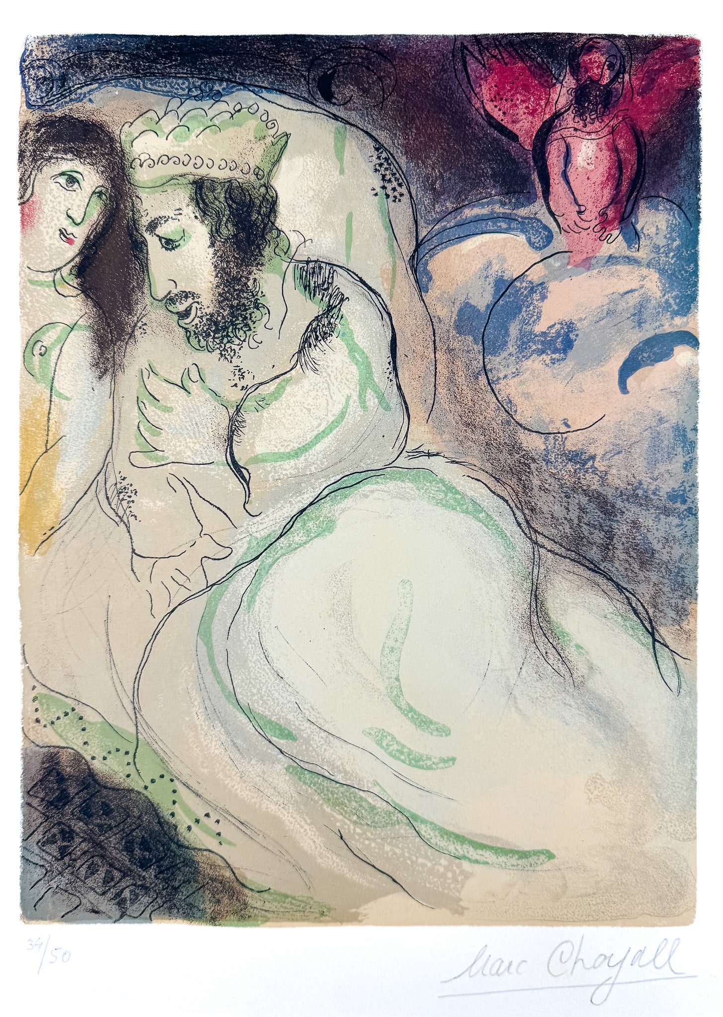 Diese farbige Lithographie von Marc Chagall aus dem Jahr 1960 gehört zu den poetischsten Blättern seines biblischen Zyklus. Das Werk verbindet erzählerische Dichte mit einer leisen, traumhaften Bildsprache und entfaltet seine Wirkung im ruhigen, konzentrierten Betrachten. Als Teil der renommierten Bibel-Folge besitzt das Blatt hohe kunsthistorische Bedeutung und besondere Attraktivität für Sammler.