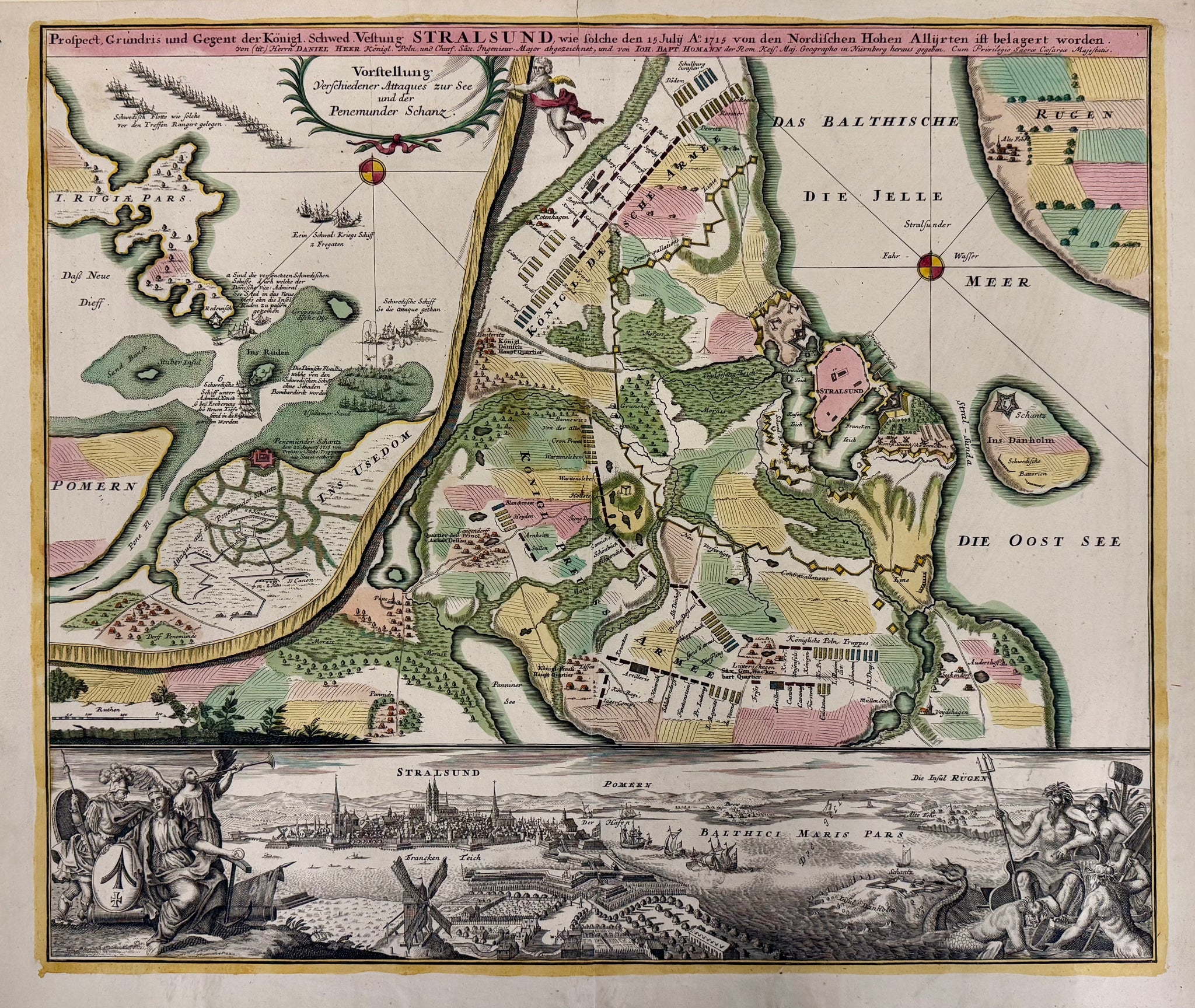 Stralsund - Plan mit Gesamtansicht : Johann Baptist Homann / Daniel Herr - Original Kupferstich - 1730