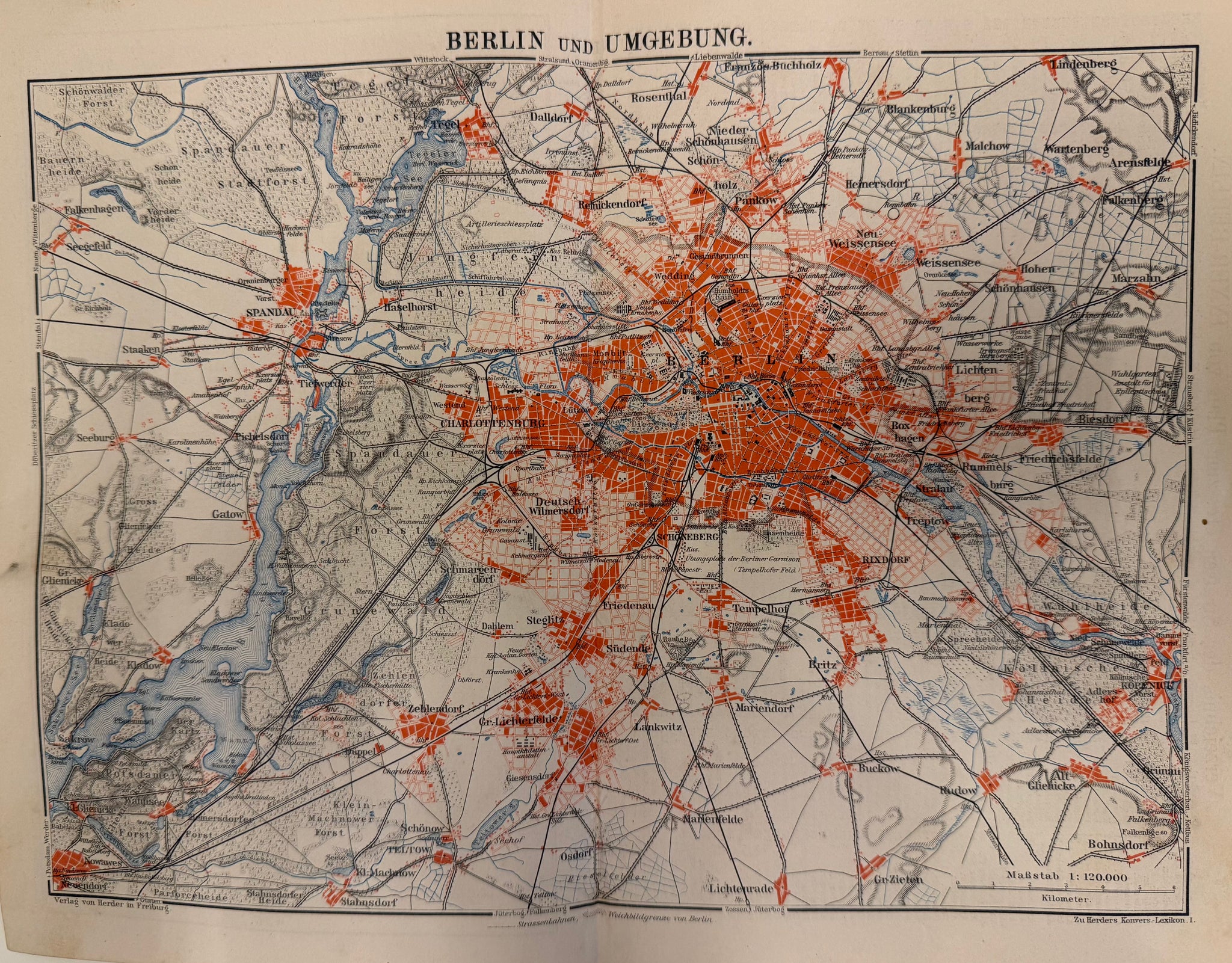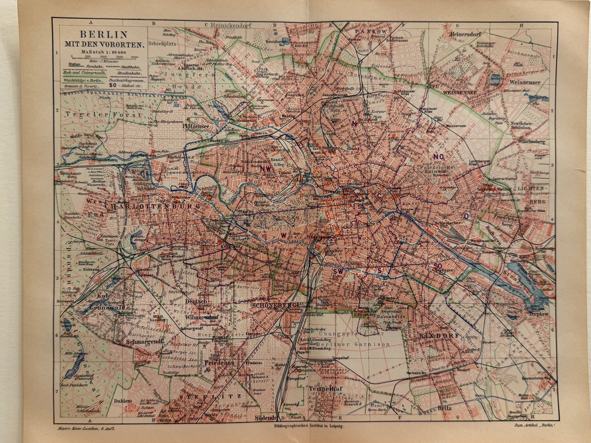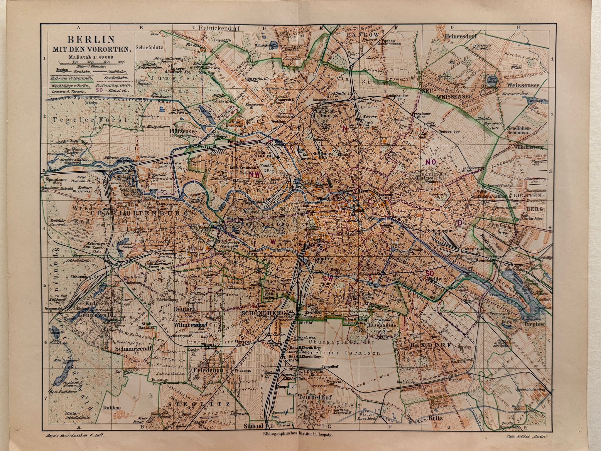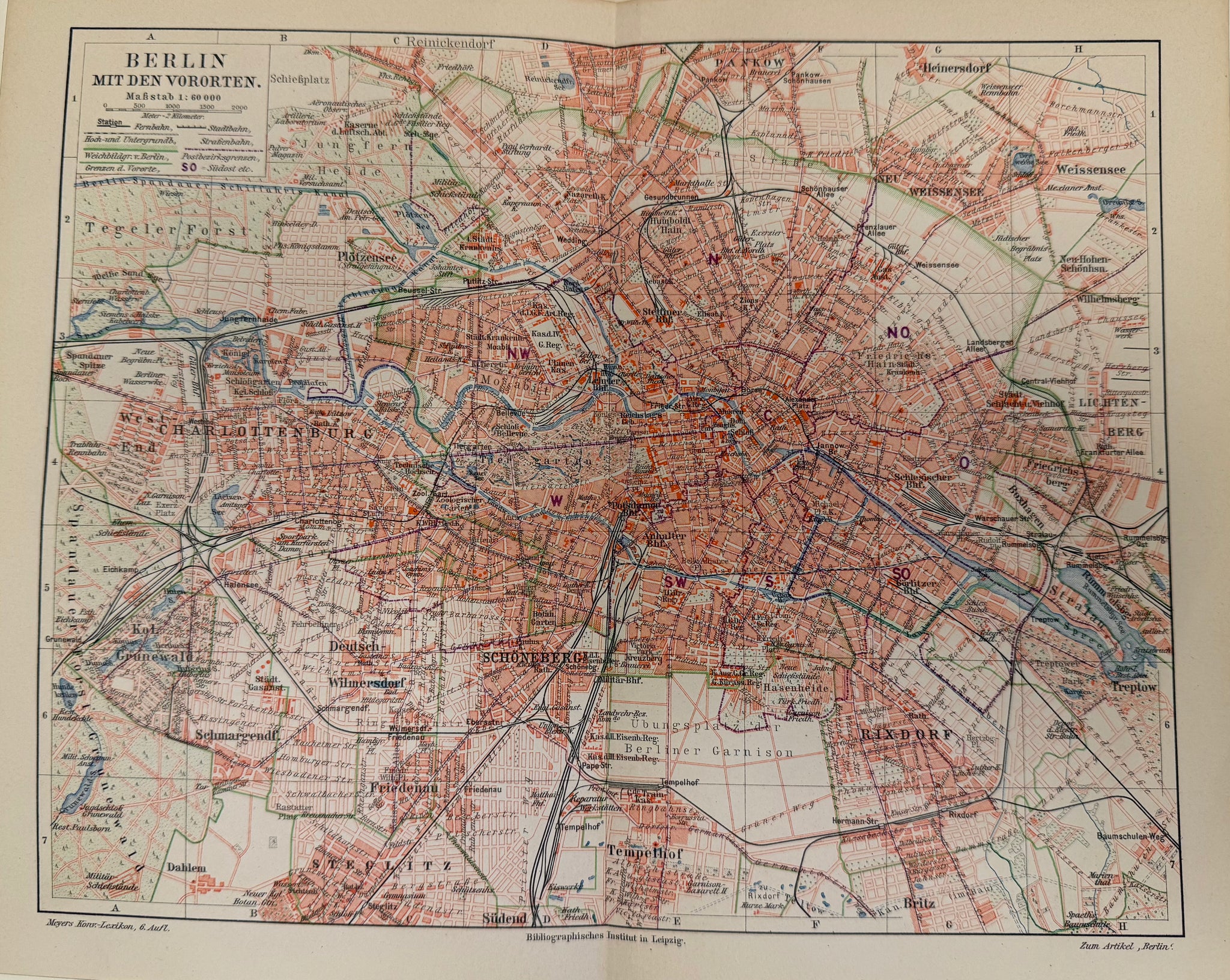 Berlin - Plan - mit Vororten : Herrmann Julius Meyer - Original Lithografie - 1908